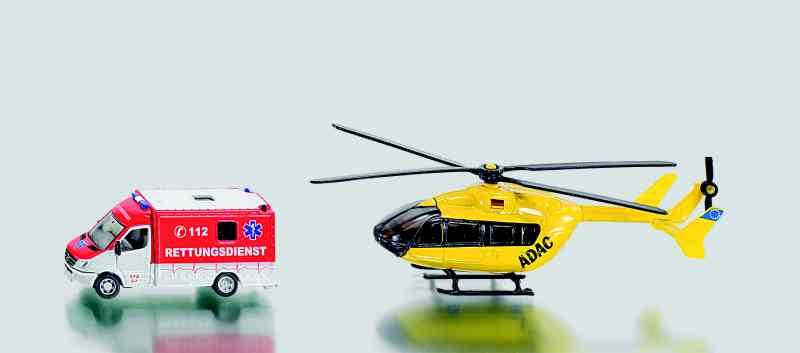 Sanitkou Mercedes Sprinter a vrtulník Eurocopter EC 145 ADAC vždy přispěchají na pomoc v nouzi. Oba modely jsou téměř celé vyrobeny z kovu a zaujmou precizními detaily. Rotory helikoptéry se mohou otáčet.
